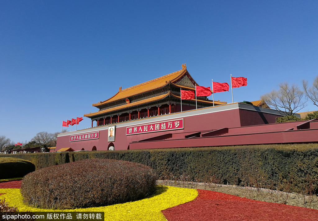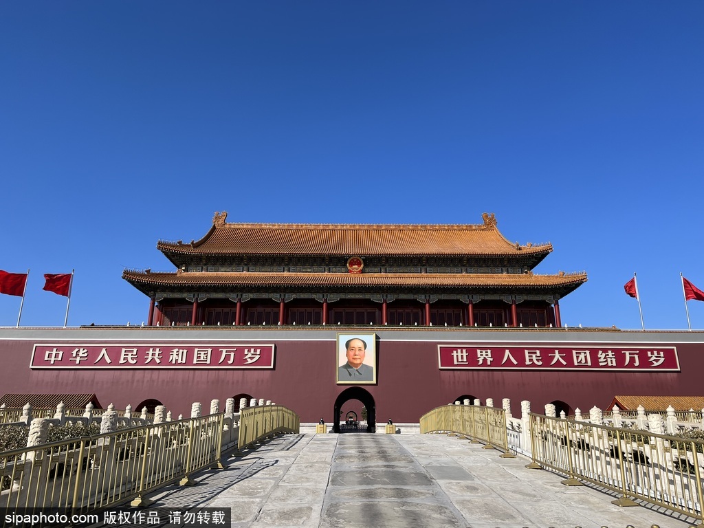 Tian'anmen, située au centre de Beijing, à l'extrémité sud de la Cité interdite, et en face de la place Tian'anmen, du Monument aux héros du peuple, du Hall commémoratif du président Mao, du Grand Hall du peuple et du Musée national de Chine. Tian'anmen couvre une superficie de 4 800 mètres carrés et est réputée pour son art architectural exceptionnel et son statut politique particulier.