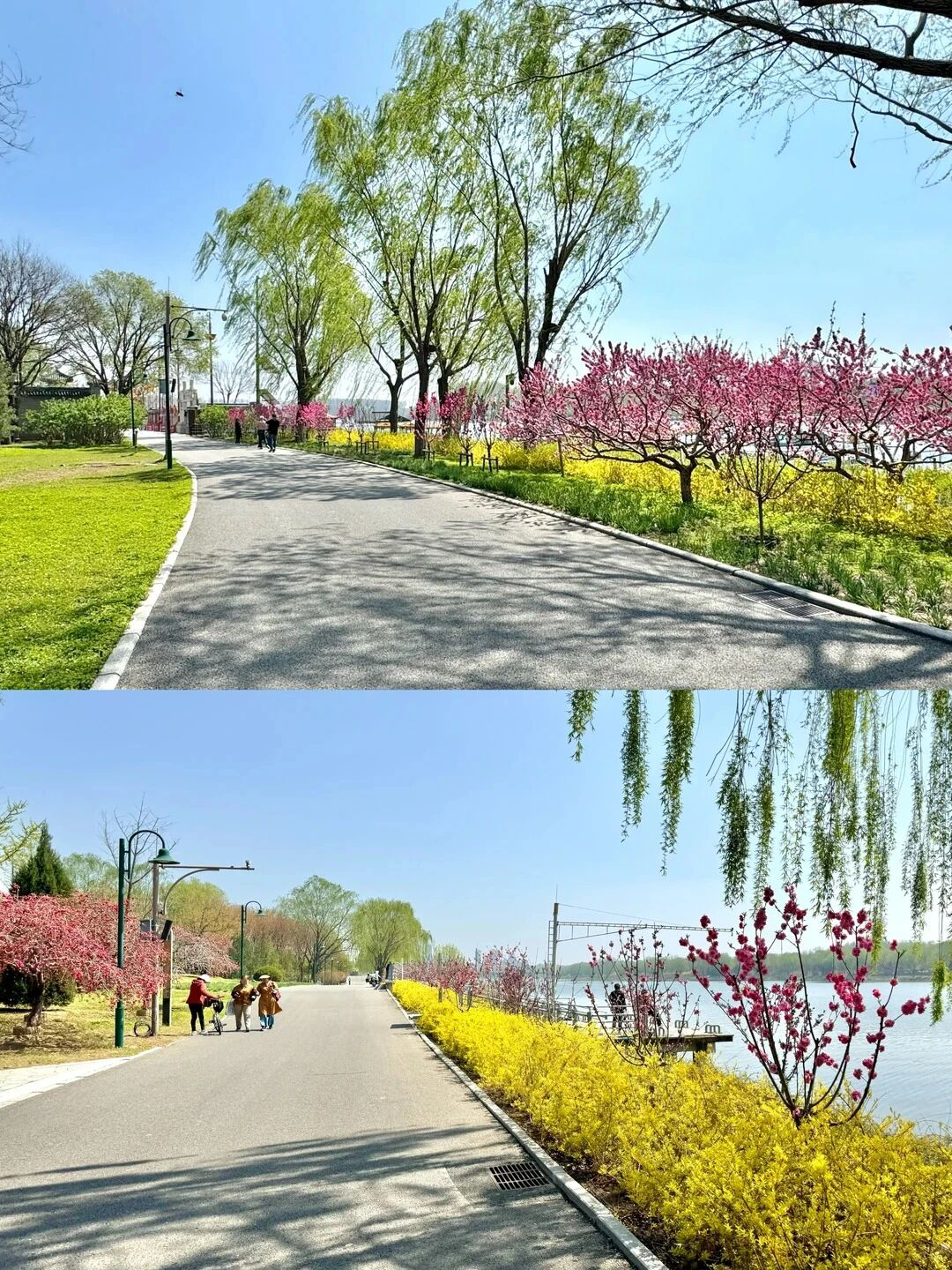 Au printemps, ce parc offre un paysage enchanteur : une eau bleue et calme, des berges fleuries sinueuses sur les deux rives, et des pêchers roses qui bordent les allées. Il est parfait pour les randonnées florales, les sorties en famille ou les balades à vélo pour se détendre.